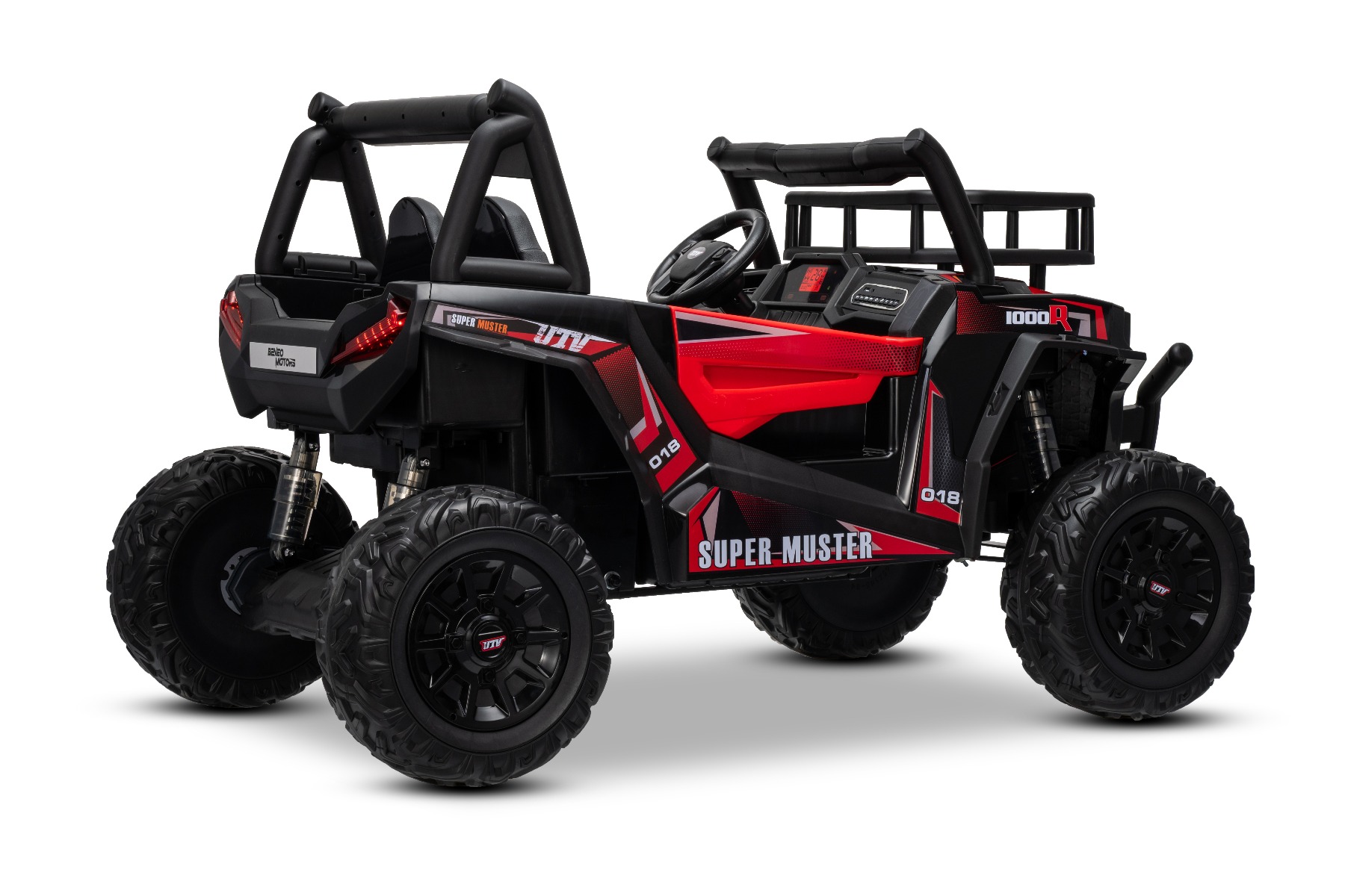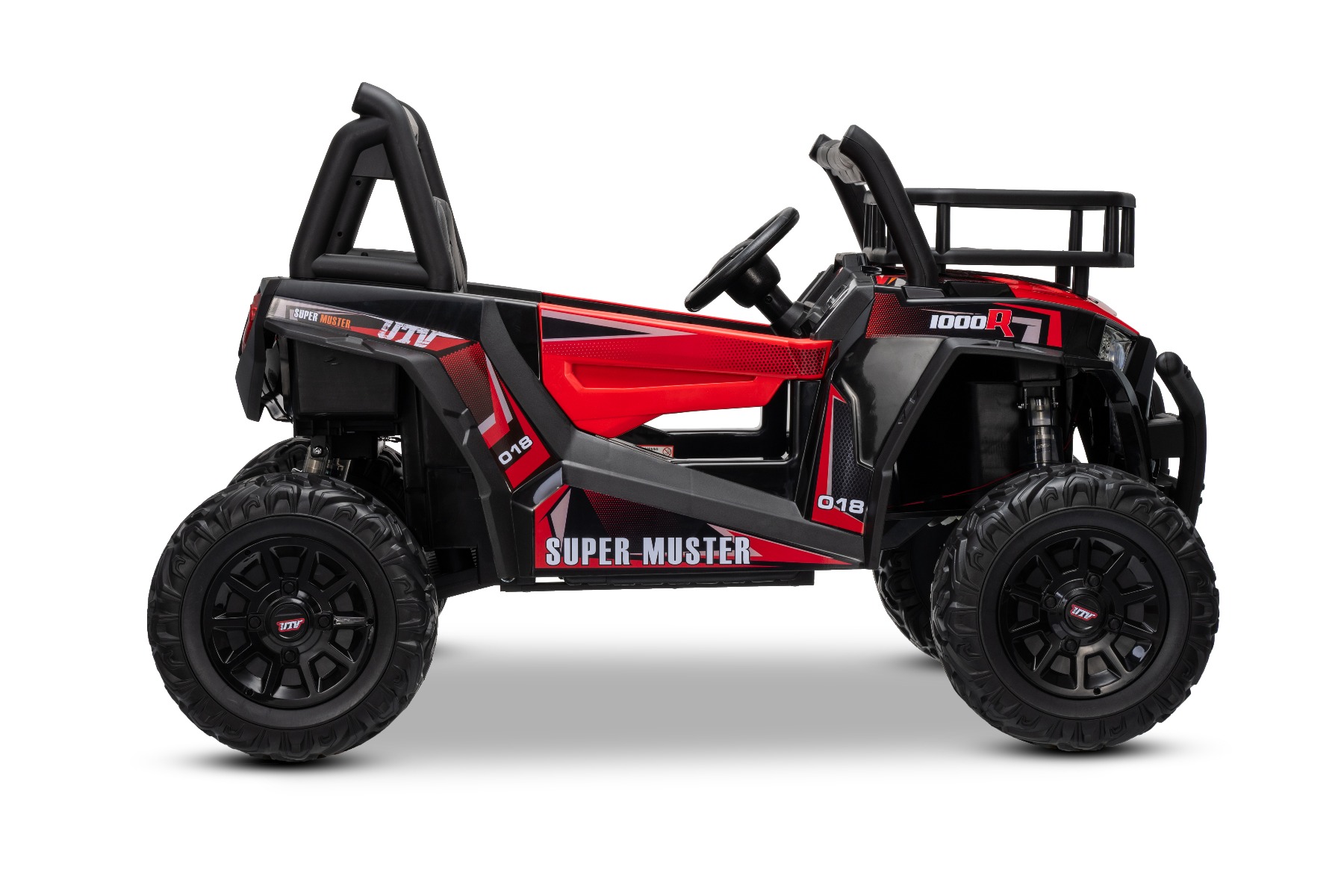 Mașină electrică pentru copii UTV 24V, roșie, două locuri, motor 2 x 200 W, Baterie litiu, roți EVA, osii cu arcuri, frână electrică, scaun tapițat, 2.4 GHz DO, două locuri, USB, AUX