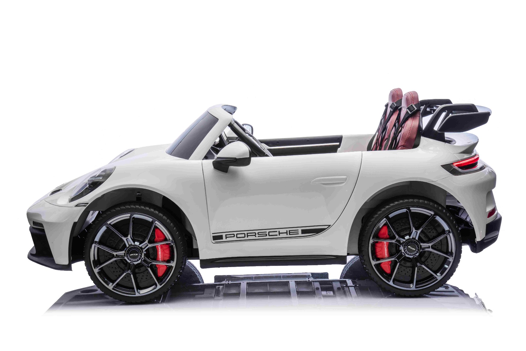 Mașină electrică copii Porsche 911 GT3 24V cu tracțiune 4x4, alb, scaun cu două locuri, telecomandă 2.4 GHz, intrare USB/AUX, motoare 200W, suspensie, baterie litiu, lumini LED față și spate, licență ORIGINALĂ