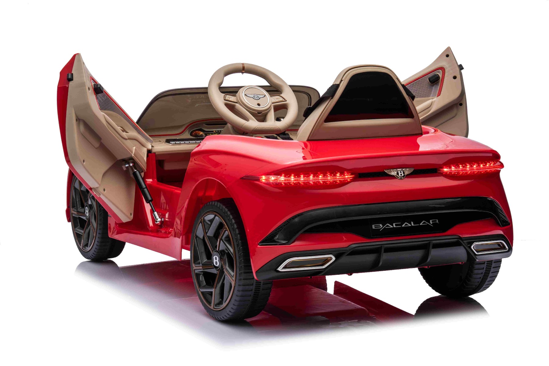 Mașinuță electrică de jucărie Bentley Bacalar 12V, roșu, Uși care se deschid vertical, Telecomandă 2.4 GHz, Lumini LED, Intrare USB/Aux, Suspensie, Baterie litiu, Motor 2 X 25W, Licență ORIGINALĂ