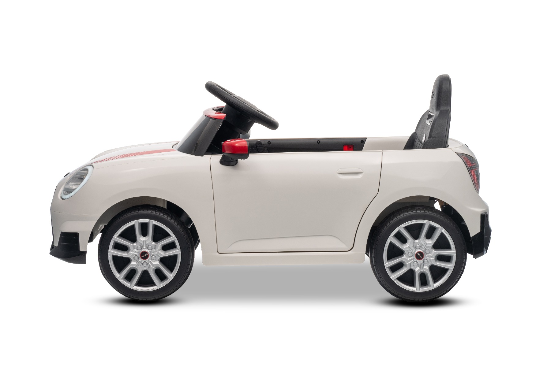 Mașinuță electrică elegantă cu design emblematic MINI. Modelul este echipat cu o pereche de uși care se deschid, ce permit o îmbarcare confortabilă. Când comutatorul este pornit, modelul imită sunetul pornirii, iar luminile LED față și spate se aprind. Există efecte sonore precum claxon, sunet de condus, cântece sau melodii. Există o intrare USB și conexiune Bluetooth, iar volumul este controlat direct prin intermediul playerului MP3 încorporat.