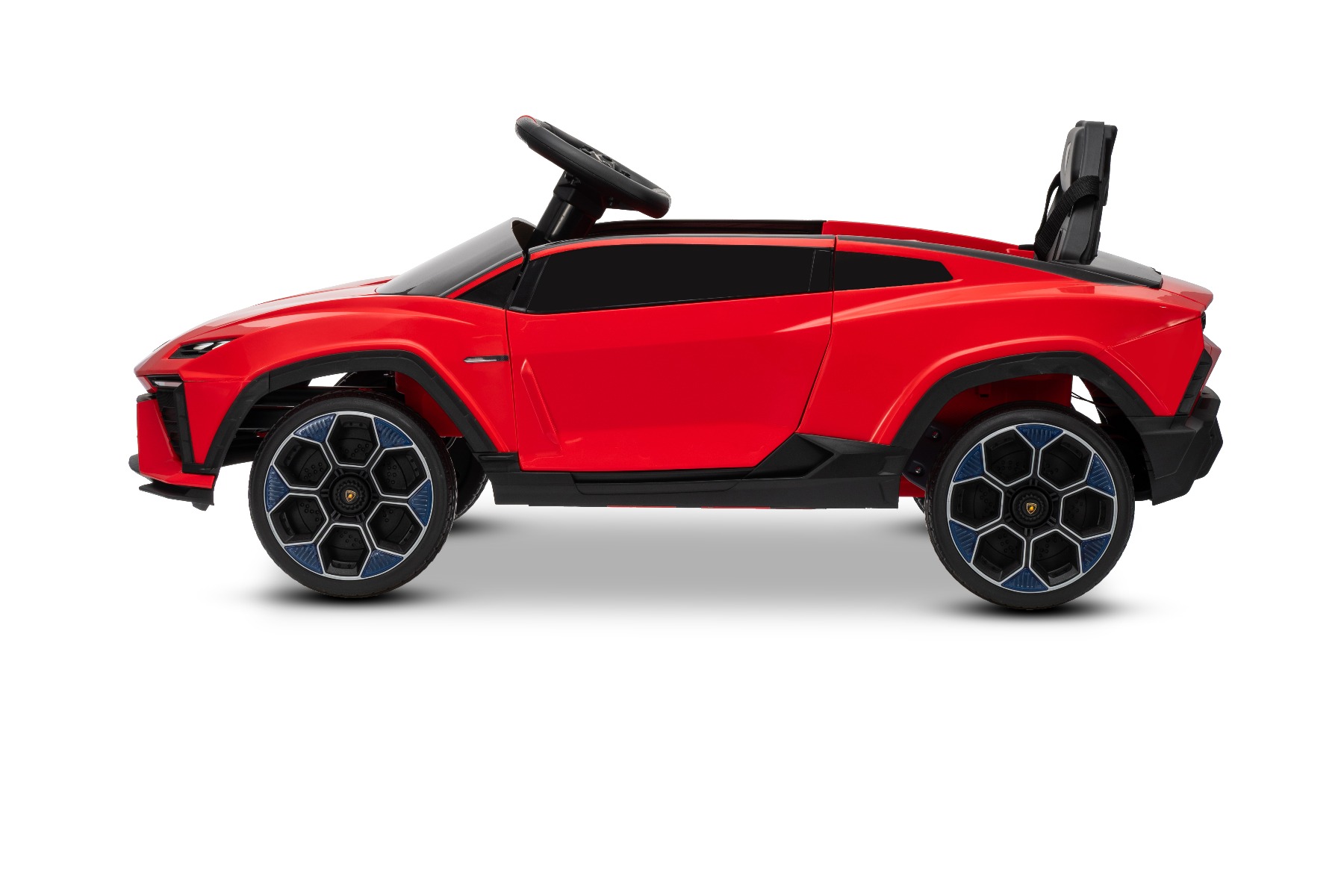 Mașinuță electrică de jucărie Lamborghini Lanzador 12V cu licență originală, tracțiune spate, un singur loc, roșu, baterie litiu, lumini LED, scaun lat, telecomandă 2.4 GHz, player MP3 cu intrare USB/AUX și conexiune Bluetooth
