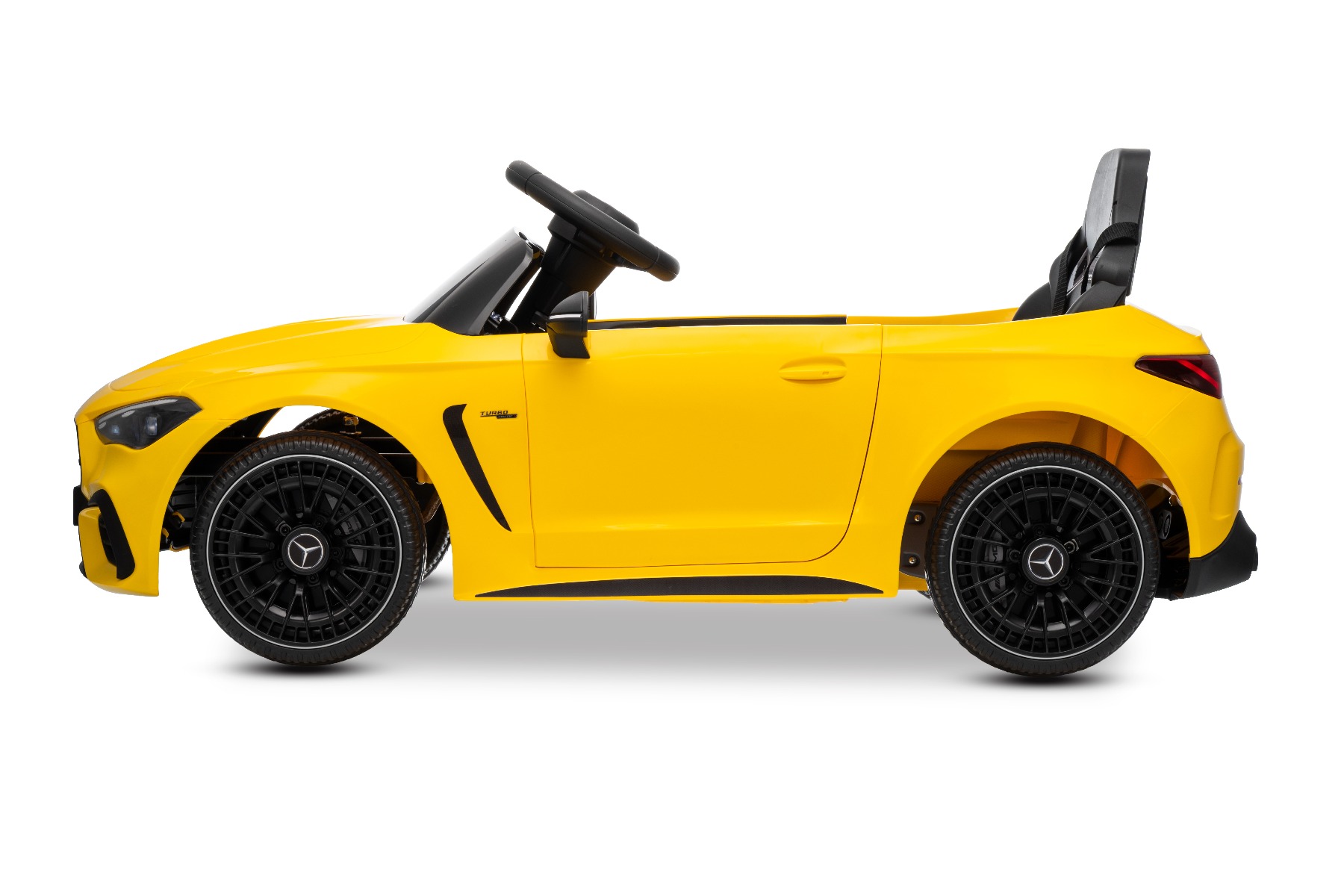 Mașinuță electrică de jucărie Mercedes CLE 12V cu tracțiune spate, galben, scaun individual, baterie litiu, lumini LED, scaun lat, telecomandă 2.4 GHz, player MP3 cu intrare USB/AUX și conexiune Bluetooth, licență ORIGINALĂ