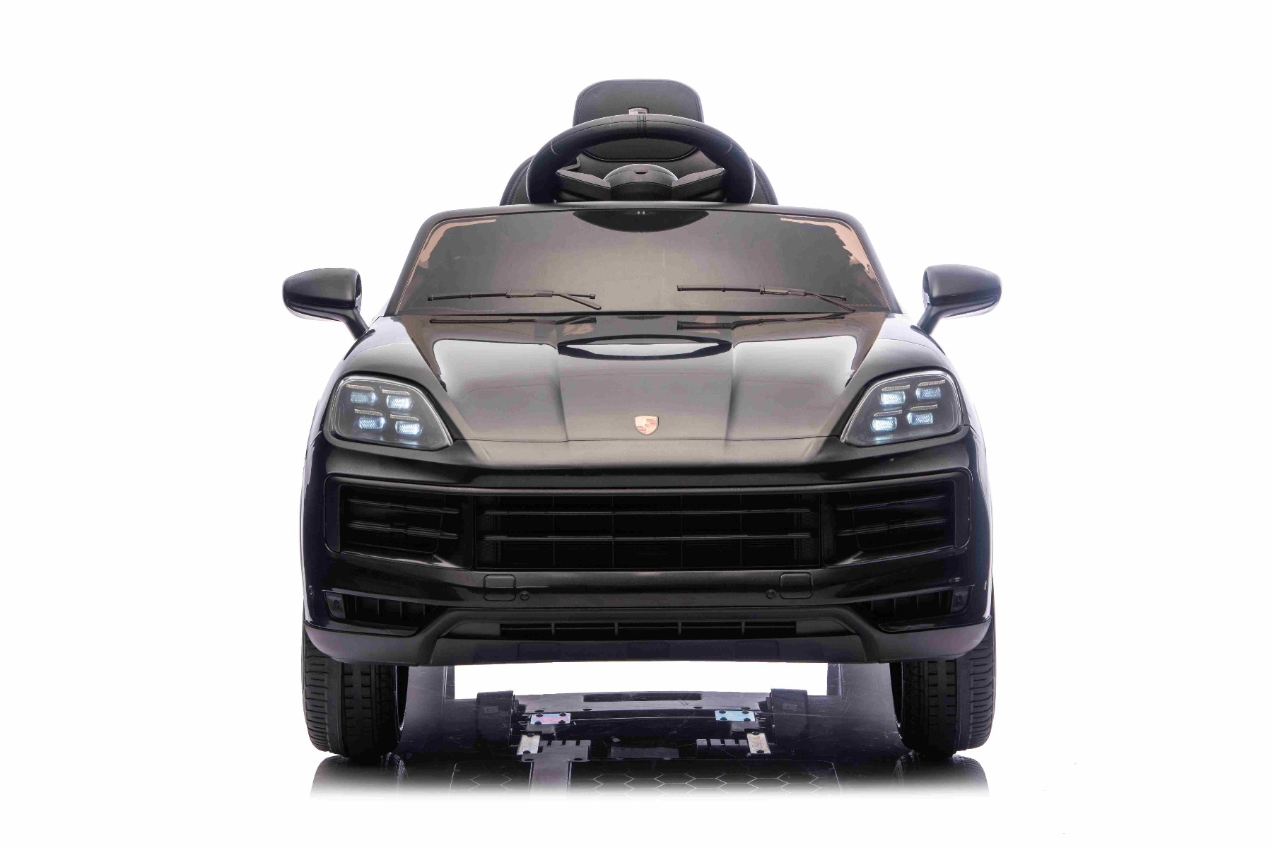 Mașinuță electrică copii Porsche Cayenne 12V cu tracțiune spate și licență origianlă, un singur loc, negru, baterie litiu, scaun lat, axe cu suspensii, telecomandă 2.4 GHz, player MP3 cu intrare USB/AUX, lumini LED