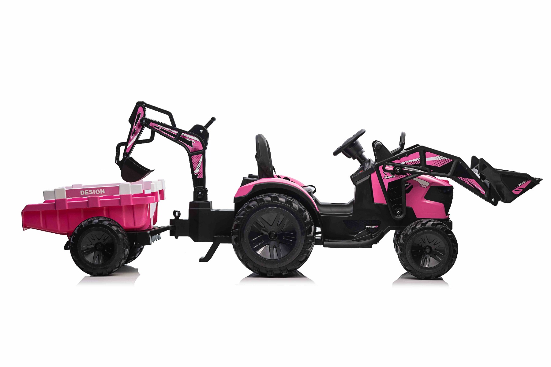 Tractor electric TOP-WORKER 12V cu cupă și remorcă, Roz, Scaun simplu, moale din PU, MP3 Player cu intrare USB, Tracțiune spate, Motor 2 x 45W, roți EVA, Baterie litiu, Teldecomandă